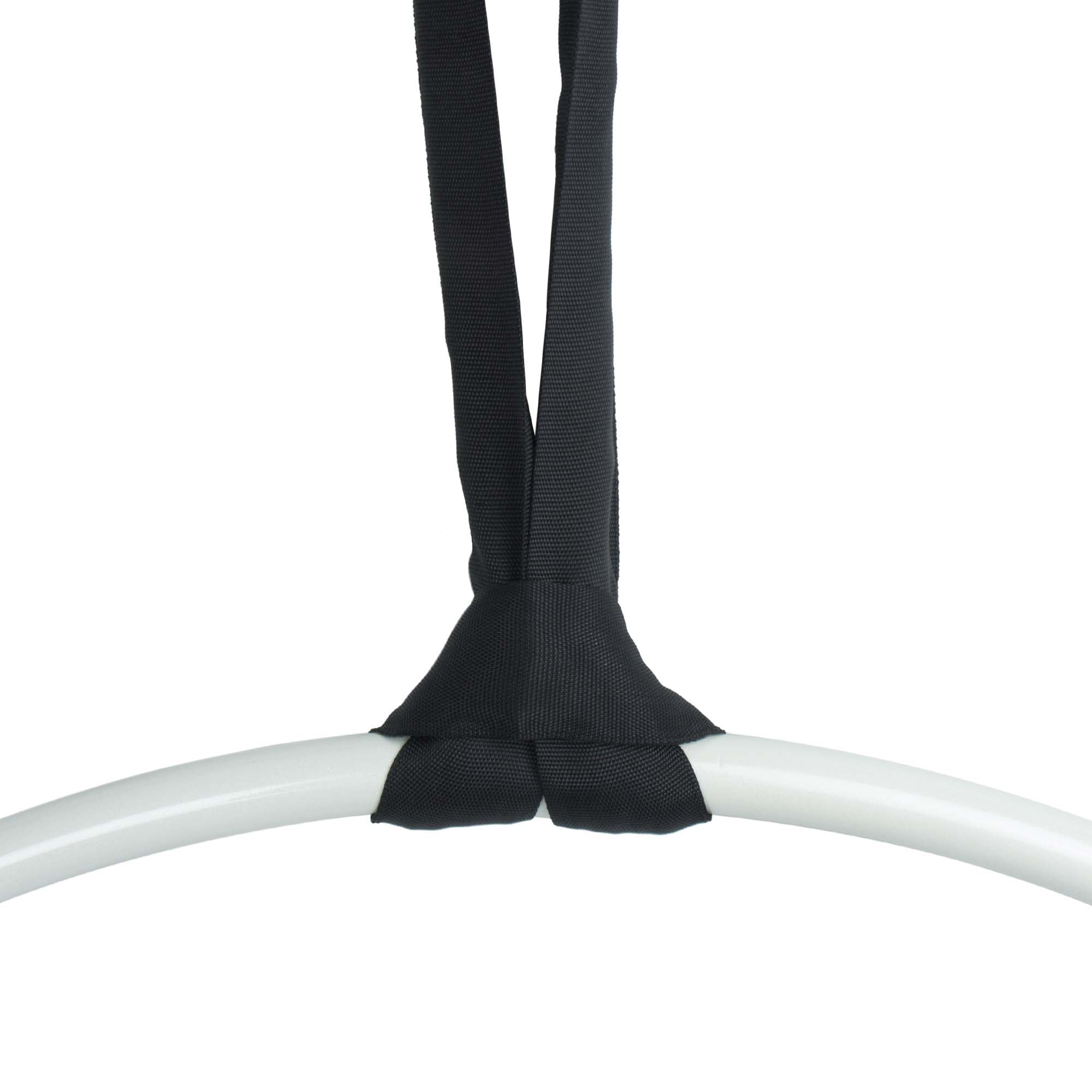 Black circular polyester fibre slings used for rigging, also known as strops, round slings and span sets.